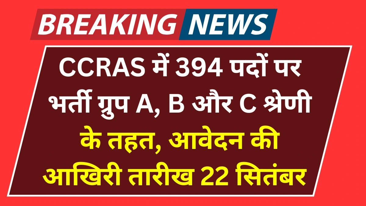 CCRAS Recruitment 2025: आयुष मंत्रालय के अधीन आने वाले केंद्रीय आयुर्वेदिक विज्ञान अनुसंधान परिषद (CCRAS) ने बड़ी संख्या में वैकेंसी निकाली है। ग्रुप A, B और C श्रेणी के तहत कुल 394 पदों पर भर्ती प्रक्रिया चल रही है। पहले इन पदों के लिए आवेदन की आखिरी तारीख 31 अगस्त 2025 तय की गई थी, लेकिन अब इसे बढ़ाकर 22 सितंबर 2025 कर दिया गया है। ऐसे उम्मीदवार, जो अब तक आवेदन नहीं कर पाए थे, उनके लिए यह एक बड़ा मौका है। आवेदन केवल CCRAS की आधिकारिक वेबसाइट पर ऑनलाइन मोड से ही स्वीकार किए जाएंगे।